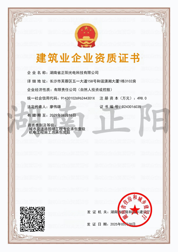 2025年5月28日,經(jīng)湖南省住房和城鄉(xiāng)建設(shè)廳審核批準(zhǔn),湖南省正陽光電科技有限公司成功獲得“機電工程施工...